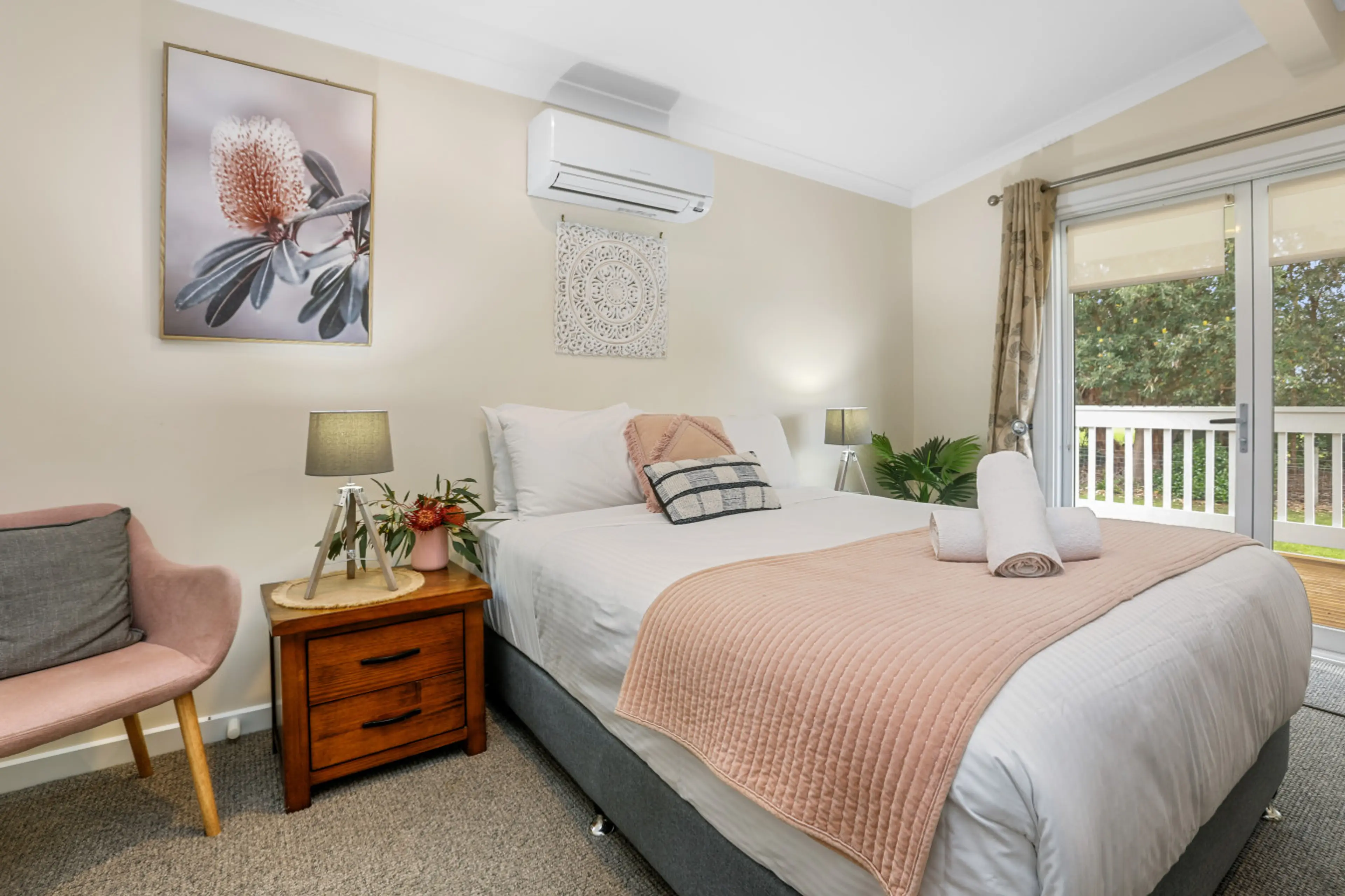 Your private studio is one of three onsite and is thoughtfully designed with relaxation in mind. A plush queen bed with cozy linens ensures a peaceful sleep, and the modern ensuite features a rainfall shower, fluffy towels, and everything you need to refresh after a day of beach walks or seaside adv...